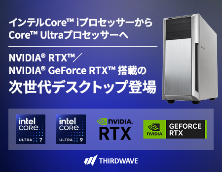 | NVIDIA RTX™ 4500 Ada 24GB | THIRDWAVE 4CXQ45A Intel Core Ultra搭載 | THIRDWAVE 4CZQ45A Intel Core Ultra搭載 |