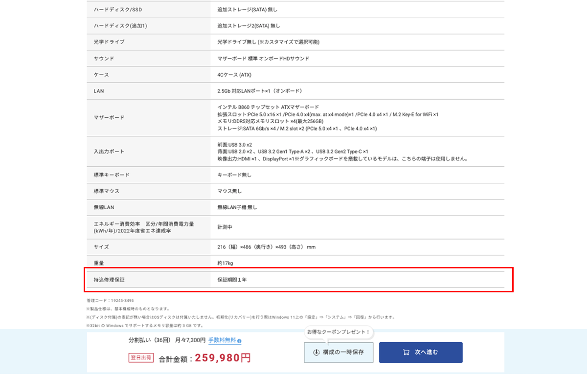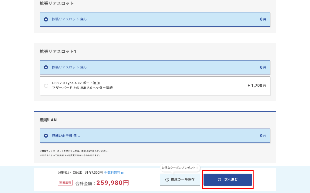 手順② 画面の下部「サービス:BTOパソコンの追加保証」項目で延長保証をご選択いただけます。